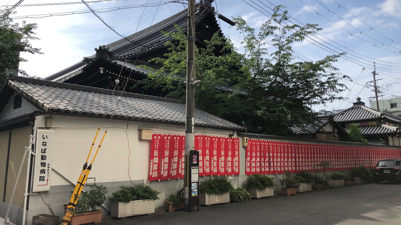 烏丸通り沿いに、ひっそりと鳥居などが建っています。御旅所とは、八坂神社の祇園祭の際、神輿が立ち寄って安置される場所です。こちらの御旅所には、大政所神輿などが立ち寄ったことから、この名前となりました。令和2年、重要文化財に指定されています。