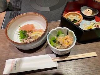 内容は、先付け・お造り6点盛り・茶碗蒸し・ステーキ・魚のホイル包み・海鮮鍋・握り寿し・デザートがついています。
