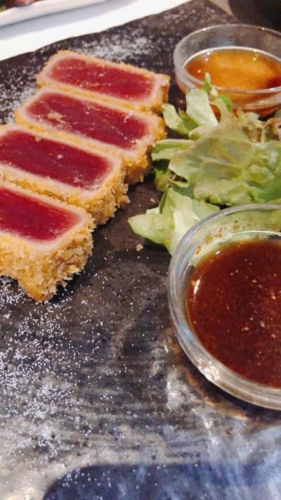 今回は、鮪のレアカツ・新得地鶏の胸肉のタタキ・出汁巻き玉子・馬肉ヒレ刺し・穴子白焼きを注文。