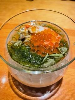 料理は、じゅんさいと鮑とイクラが入った小鉢・芋とトウモロコシにウニが入った椀物・お造り・クエとアスパラの料理・和牛シャブシャブの椀物・土鍋で炊いた蟹ご飯が出てきました。
