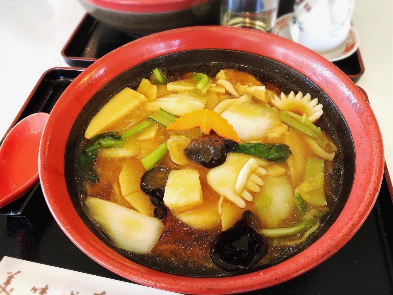 具材は、海老・イカ・帆立・豚肉・牛肉・白菜・竹の子・青菜・きくらげ・シメジなど、オイスターな中華味で美味しかったです。- 旅行時期