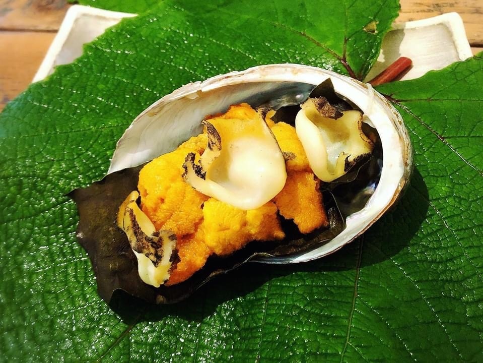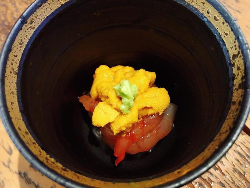 今回は、漬け甘海老の雲丹乗せ・焼き雲丹&焼き鮑・鱈とホヤの揚げ出し・雲丹鍋を注文。