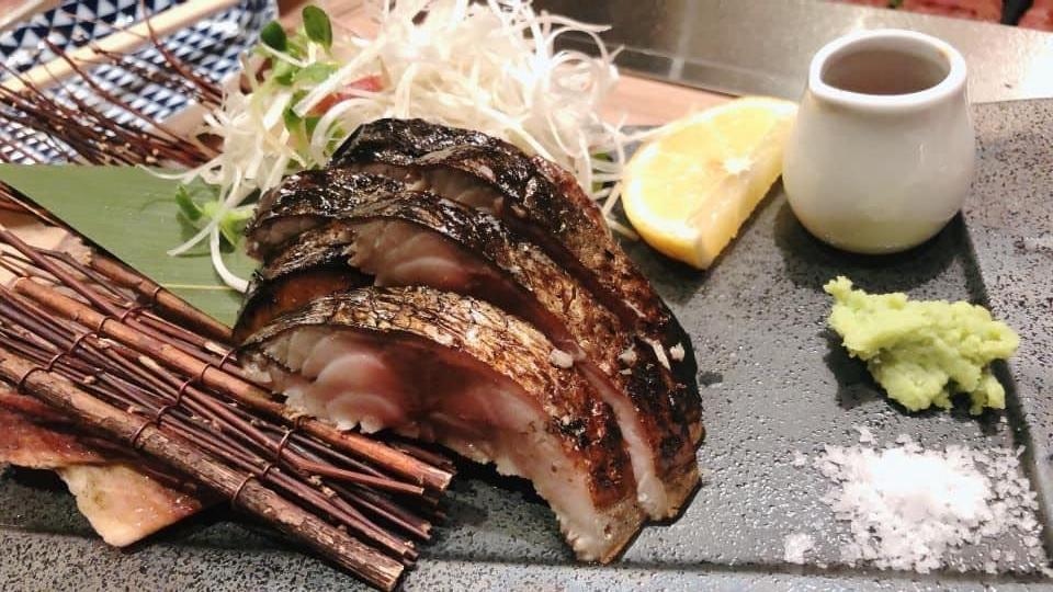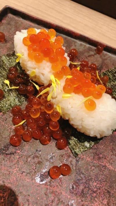 今回は、〆サバの藁焼き・熟成サガリ・活ホッキと舞茸の炭焼き・イクラおにぎり・丸ごと長茄子の揚げびたしを注文。