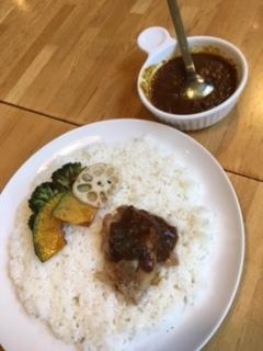 今回は、ランチの素揚げ野菜付きチキンカレーを注文。