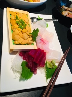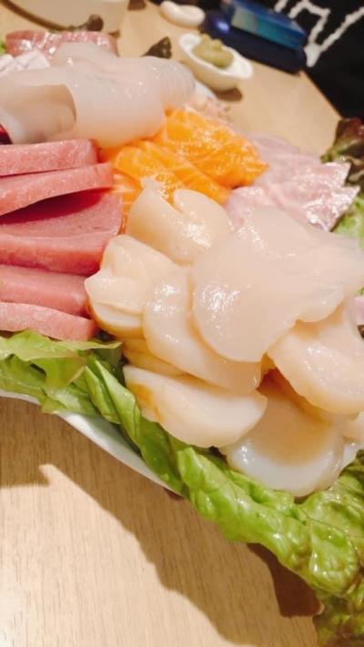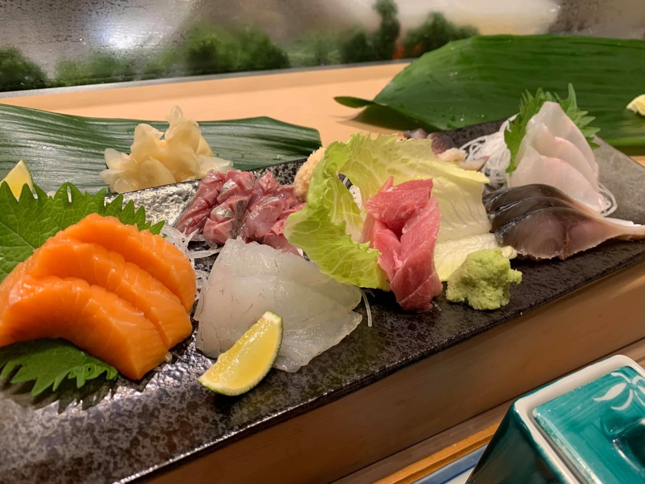 今回は、別注文で刺身盛り合わせ(中トロ・ホタテ・サーモン・イカ・カマトロ)と玉子焼きを注文。