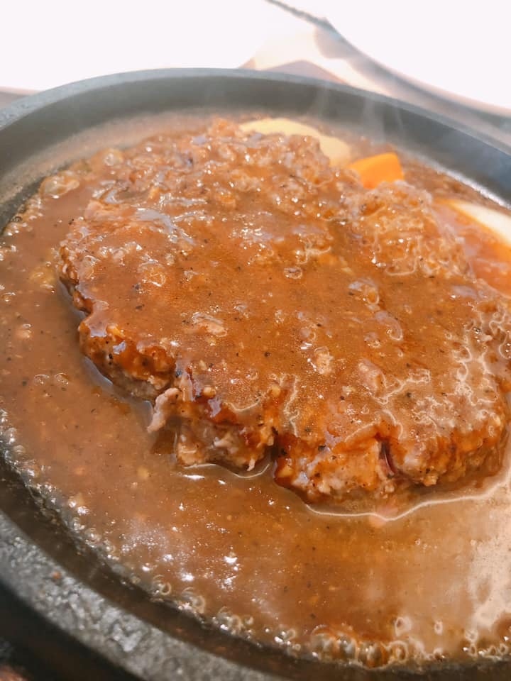 ハンバーグを割ってみると中はレアだったので、そのまま鉄板の上で少し焼いてから食べました。