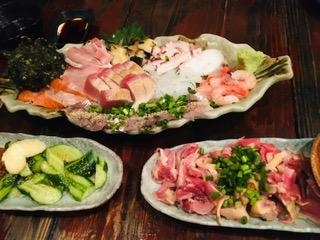 今回は、鶏のたたき・刺身盛り合わせ・ウナギ・さつま揚げ・炊き肉を注文。