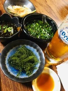 今回は、つけもずく・焼しまらっきょ・グルクンのフライ・シークアーサー酎ハイを注文。