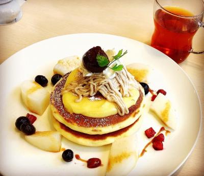 今回は、渋皮マロンとにっこり梨のブリュレパンケーキを注文。