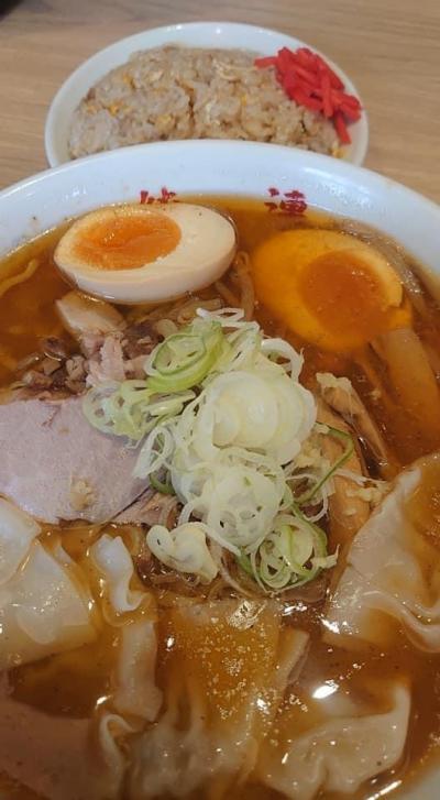 今回は、味噌ラーメンにワンタンと半熟味玉トッピングに半チャーハンを注文。