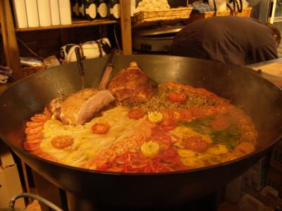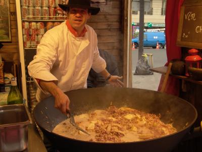 サン・ラザール駅前の屋台親爺は撮影の為正装用?帽子を被りポーズ