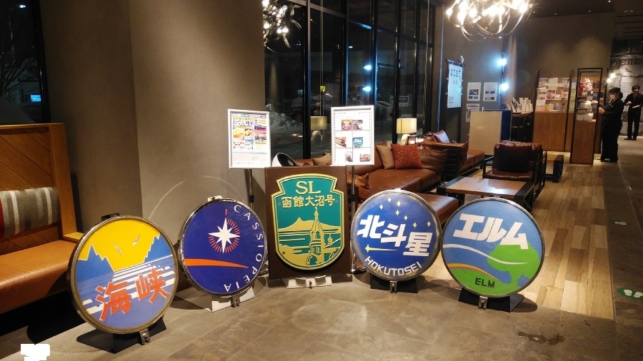 函館駅直結のホテル。JR北海道グループ運営のホテルのため、鉄道関連の演出がみられる。まず、フロント手前には青函トンネルを駆けた鉄道のヘッドマークが展示。客室からのトレインビュー(3階以上鉄道側客室の場合)も楽しめる。