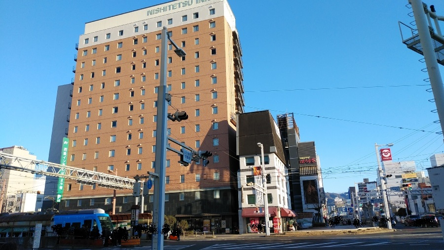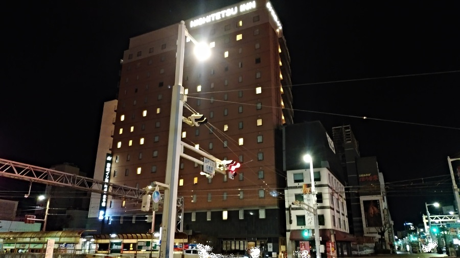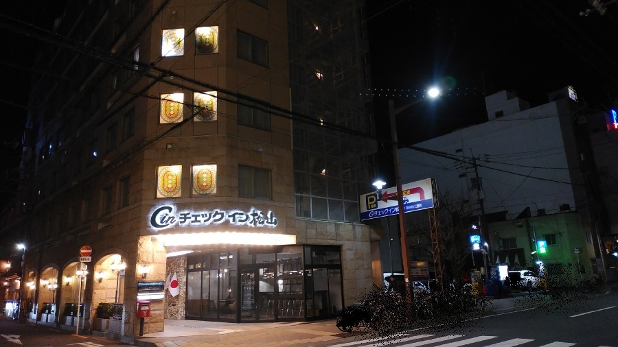 伊予鉄道市内線大街道駅から徒歩5分くらいのところにあるホテル。チェックインは機械で行いスムーズ。室内はミネラルウォーターのサービスがあった。