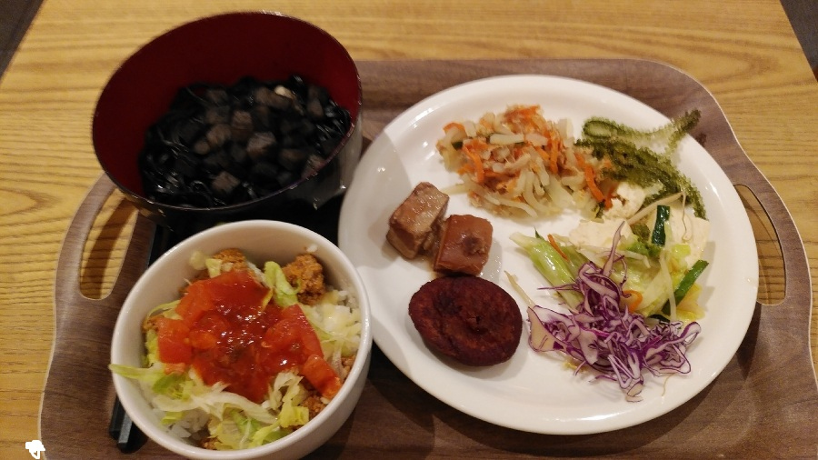 このホテルの特徴はウェルカムドリンク。琉球泡盛やオリオンビール、アイスクリームやサーターアンダギー、アーサー汁など、沖縄ならではの味覚を楽しむことができた。また、朝食付きのプランでは沖縄そばやたこライス、ゴーヤチャンプルー、海ブドウといった食材のバイキングがあり種類も豊富、全部を味わえないくらいのボリュームがあった。6時30分から開始で、朝早く観光をスタートできた。