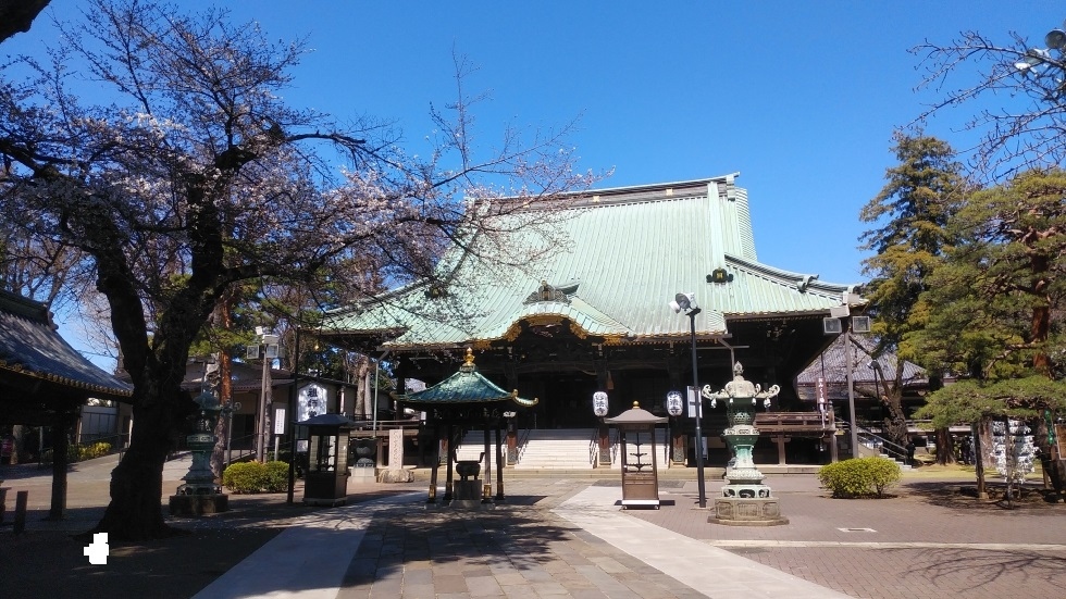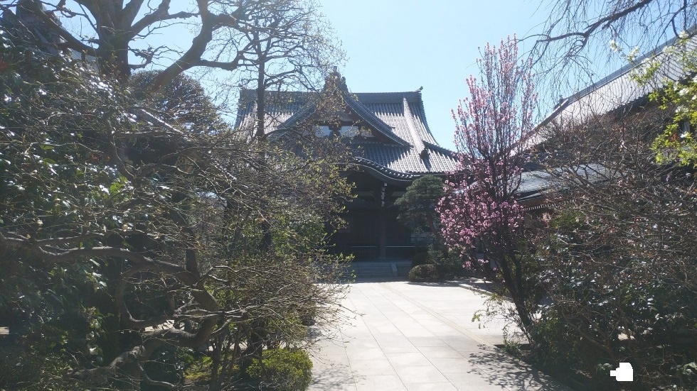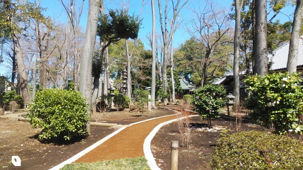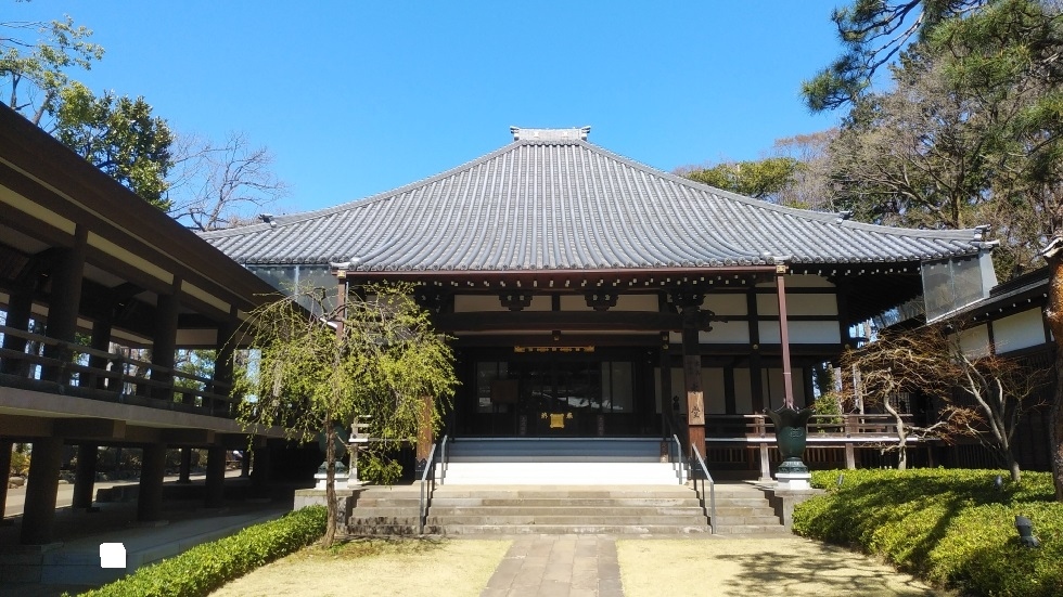 環七から一本入った住宅街の通り沿いに入り口がある。境内はよく整備されており、舗装された地面に盆栽のような庭木が落ち着いた空間を醸し出していた。本堂の建物もお寺らしい造り、階段が設けられ高い場所にあるのが特徴的だった。