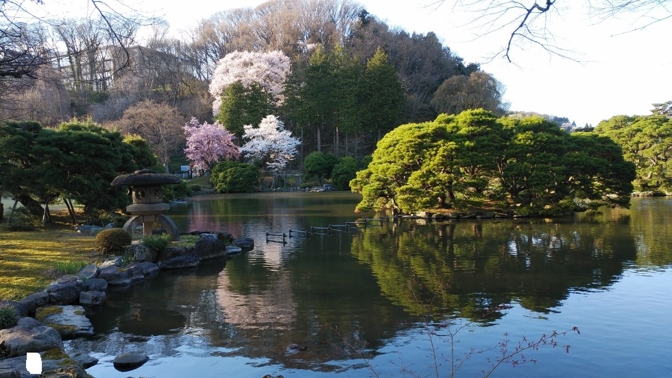 池を中心とした回遊式庭園で、無料で見学できるのが良い。紅葉が綺麗そうだが、春も青々とした木々が見ごたえがあった。桜はごく一部だったが満開で見ごろを迎えていた。- 旅行時期