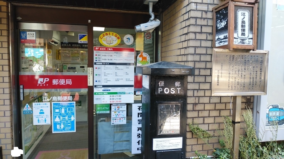 江ノ島駅から徒歩20分くらいのところにあるスポット。江島神社の参道で両脇に焦点が並ぶ中にある郵便局だが注目は黒く細長いポスト。明治時代は今とは違う色や形をしていたのだと勉強になった。日曜日で細い参道にはかなりの観光客がおり、郵便局の前もなかなか人が途切れなかった。曜日や時間帯によってはじっくりと足を止めて見ることは難しいかもしれない。