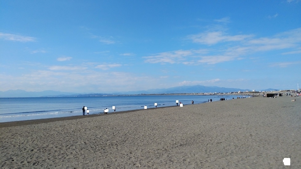 江の島から近い立地もあってか、冬の時期でもかなりにぎわっていた。砂浜自体は広さもあり、遠くには山々も眺められ開放感が感じられた。