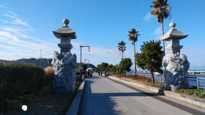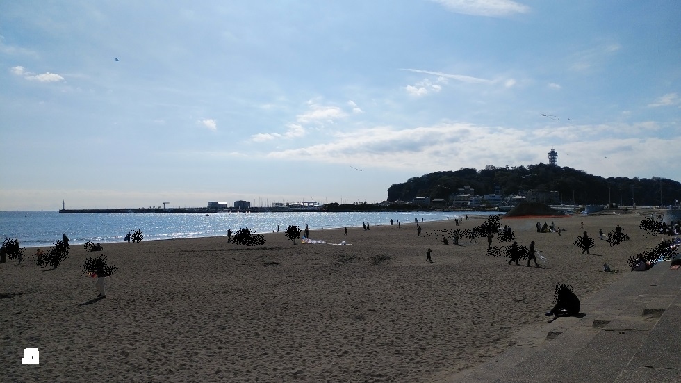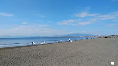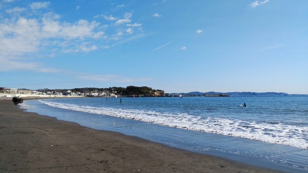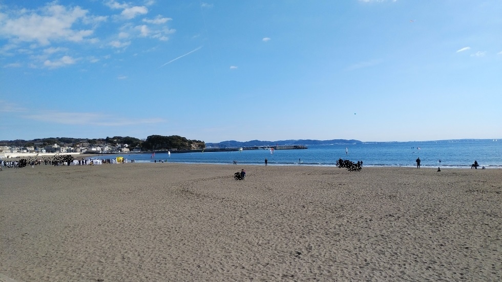 片瀬江ノ島駅から徒歩5分くらいのところにある海水浴場。正面に江ノ島を望む風景が特徴。波も穏やかな印象で、弧を描く砂浜のエリアも広かった。日曜日ということもあってか冬の時期にもかかわらず賑わいもあり、凧揚げをしている姿が目立った。