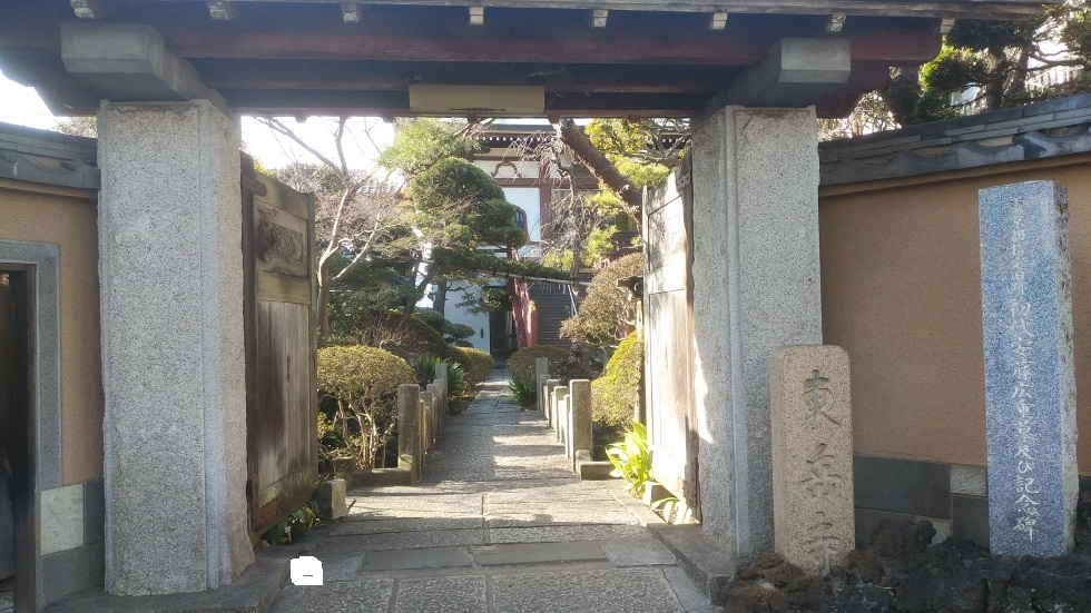 竹ノ塚駅から徒歩6分くらいのところにあるスポット。住宅や商業施設などが立ち並ぶ尾竹橋通り沿いに東岳寺があり、その境内にあった。1614年に創建された寺院で、もともとは台東区にあったものが1961年に現在地に移転した。歴史的な人物のゆかりの寺院という点も見どころだが、境内の庭園も植物が豊富でよいと感じた。