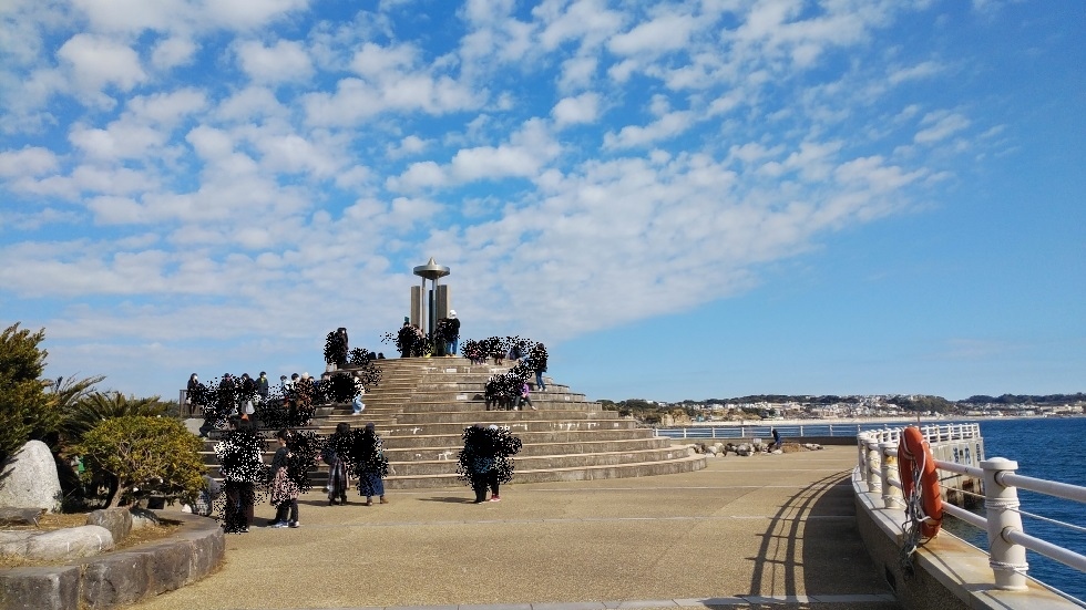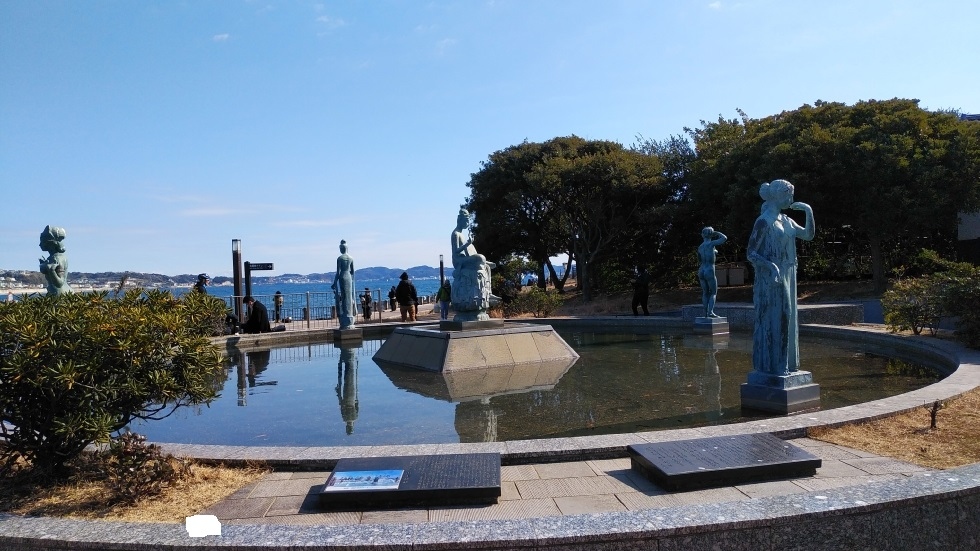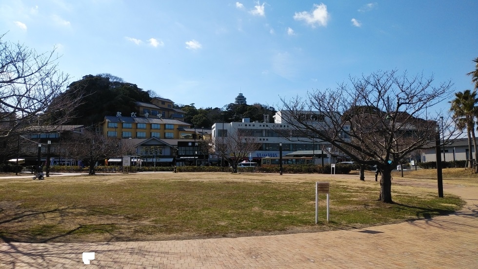 江ノ島駅から徒歩15分くらいのところにある広場。江ノ島弁天橋を渡って江ノ島に入ってすぐのところにある。