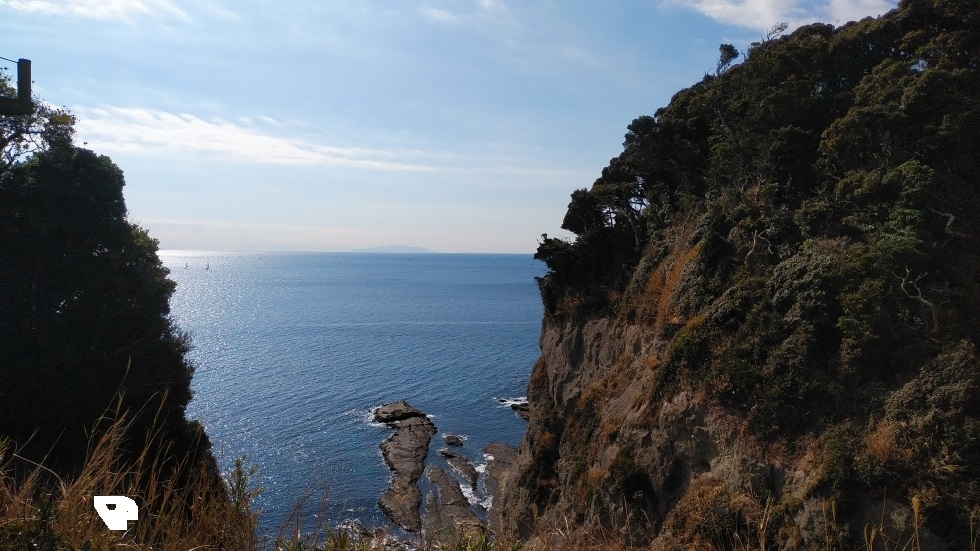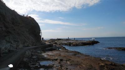 江ノ島駅から徒歩30分くらいのところにあるスポット。アップダウンのある道を進んでいくと、海岸沿いにたどり着く。