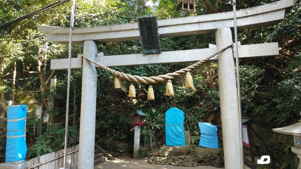 江島神社中津宮の参道の階段を進んでいると大きな鳥居が見られる。しかし、入り口はふさがれており、境内に入ることはできないようだ。調べてみると事情がある様子。入り口の鳥居は立派だった。