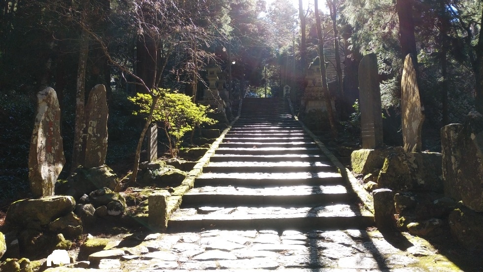 駅から1キロくらいのところに仁王門があり、そこから本堂までは道路に沿って木々の中の参道が続く。石灯籠が配置されており、神秘的な雰囲気が感じられた。なお、ほぼのぼりなので、帰り道に歩くのが良いかもしれない。