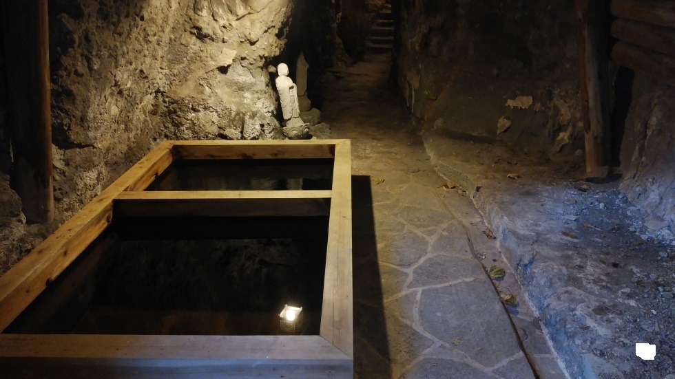 山門入り口の脇の道を進むと洞窟があり、お湯が湧き出ているのが特徴。洞窟内は一定の湿度があった。こちらは見学料が必要。