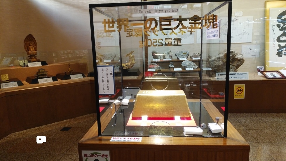 修善寺駅からバスで約50分、土肥金山下車すぐのところにある施設。土肥金山のエリア内にあり、金山の歴史や採掘後の作業工程などの展示が見られた。中でもユニークなのが千両箱の持ち上げ体験と世界一の金塊の展示。20キロ超の重さがあり、容易には持ち上げられなかった。金塊タッチは珍しい体験だが、警備の方が近くにいて、警戒していた。