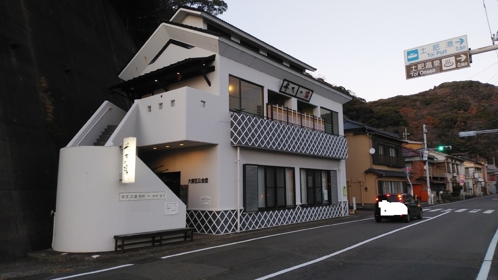 修善寺駅からバスで約50分、土肥漁港下車徒歩3分くらいのところにある共同浴場。建物の2階にあり、4人くらいが入れる内湯と2人くらいの露天風呂があった。