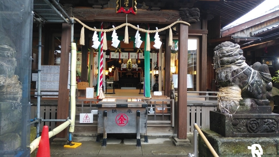 住宅街の中にあるコンパクトな神社だったが、紐でくくられた狛犬があることが特徴的。足止め狛犬というそうで珍しい風習を見ることができた。境内は改修中のようで一部足場が組まれていた。- 旅行時期