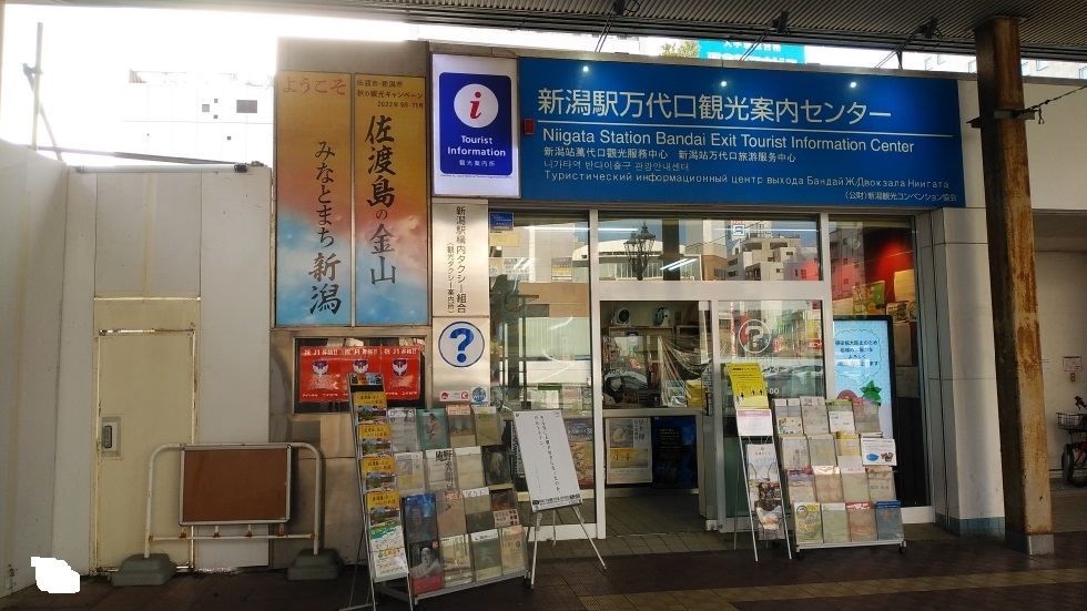新潟駅万代口下車駅構内を出て左側にある観光案内所。バスターミナル側にある小さな観光案内所だが、各種パンフレットのほか市内の交通情報、レンタサイクルなどの情報収集ができた。萬代橋から海側の施設を観光する予定を立てたが、こちらで効率よく計画を立てることができた。