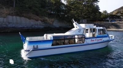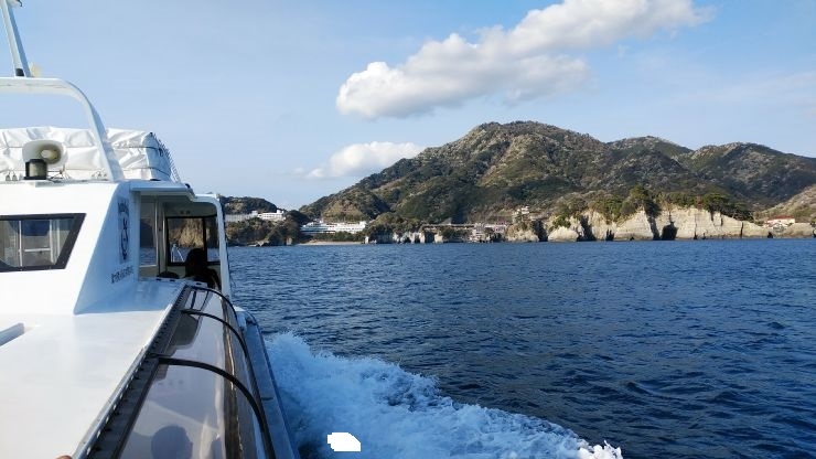 まずは周辺の海を周遊する。岩場の多い海岸で、伊豆半島の風光明媚な風景を味わえた。
