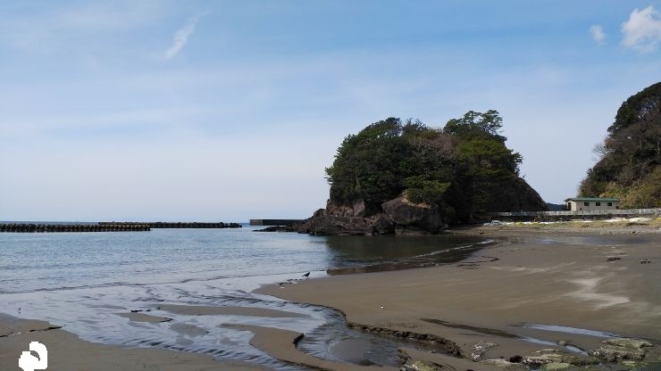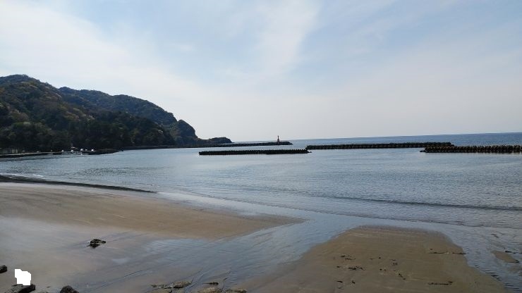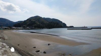 松崎バスターミナルから徒歩3分くらいのところにある海水浴場。緩やかな弧を描いた砂浜の海岸線が400メートルくらいにわたって続いていた。周辺にはホテルもあり、海水浴を楽しむには利便性が良かった。砂浜の範囲はそれほど広くはなかった。