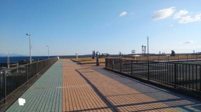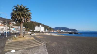 伊東駅から徒歩5分くらいのところにある海水浴場。ヤシの木が植えられた海岸線の遊歩道に砂浜が設けられ、南国風の雰囲気がした。