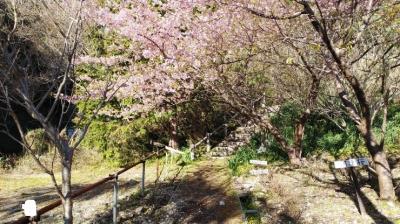 道中の道はやや荒れ気味。通行に支障が出るほどではないが、スニーカーなど軽登山に適した服装が良い。途中、河津桜も見られてよかった。