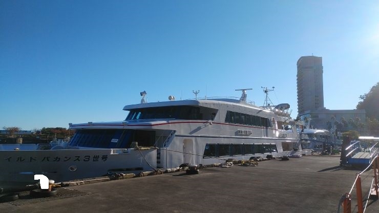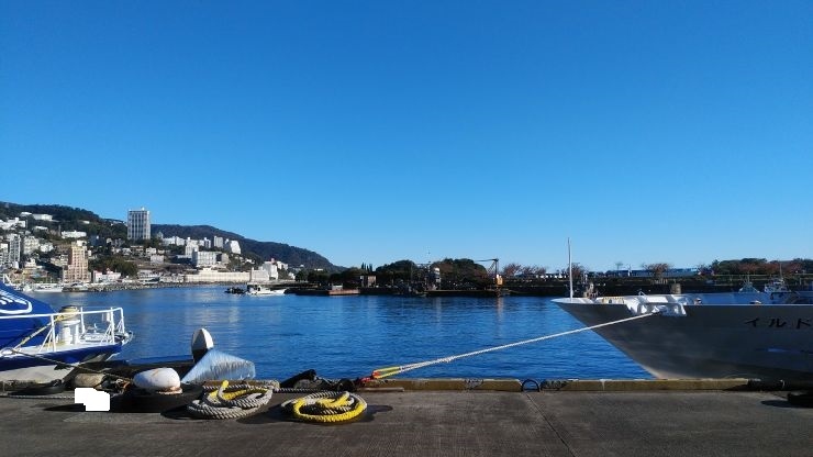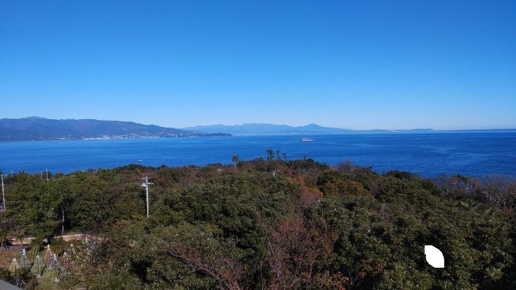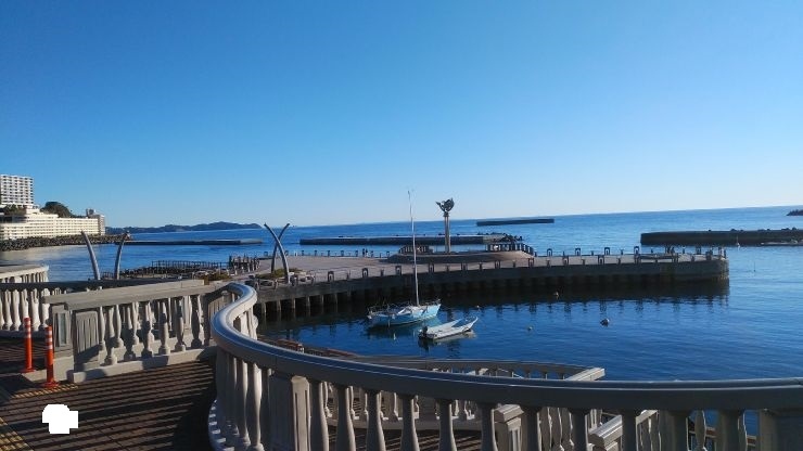 海に張り出すように設置されており、海の風景を楽しむことができた。訪れた日は天気が良かったので初島や遠く伊豆諸島の眺望を得られた。