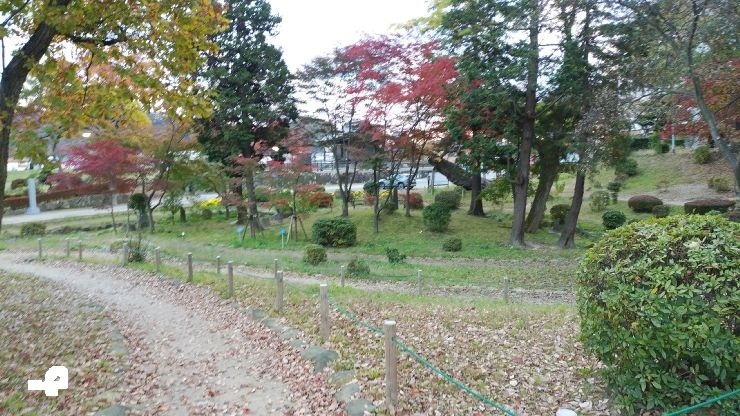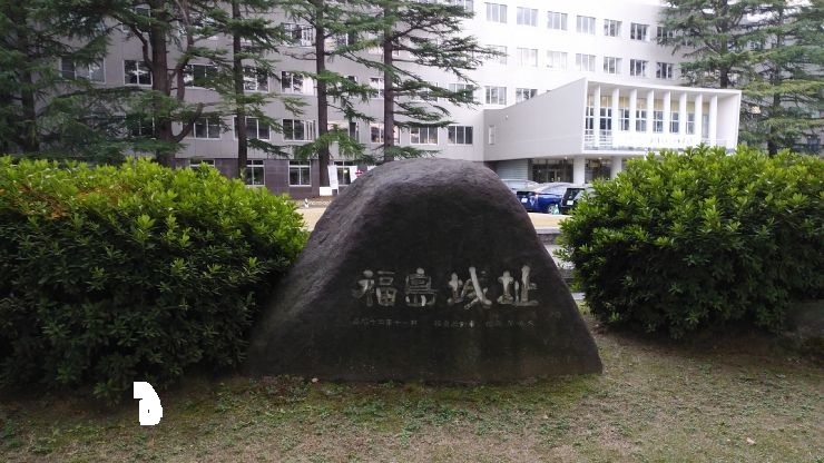 福島駅から徒歩12分ほど、福島県庁が建つ一帯がかつての城跡とのこと。石碑が正面駐輪場付近に立っており、城が建っていることを示すが、一体は平地であまり城があったことを想像できなかった。ただ、周囲を川に囲まれている立地のため、要塞としての役割を果たしていたとも感じられた。
