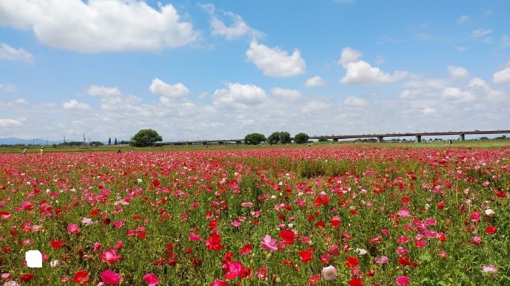 鴻巣駅から徒歩30分ほど、荒川河川敷に設けられたポピー畑。5月の中旬から下旬にかけて見頃を迎えていた。