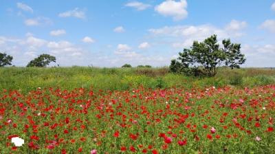 赤はシャーレーポピー、オレンジはカリフォルニアポピー、紫が麦なでしこでそれぞれを散策して楽しむことができた。