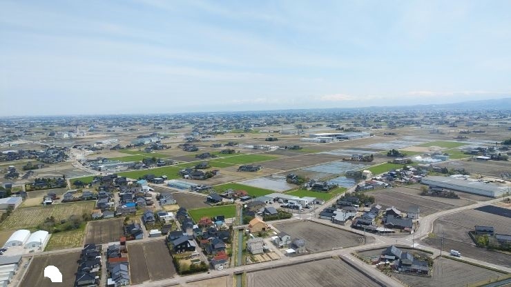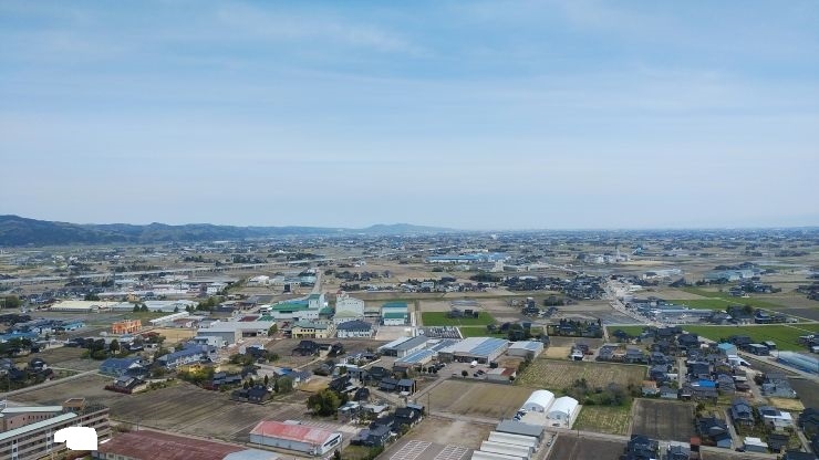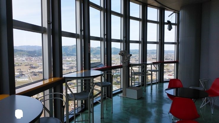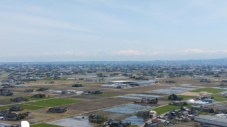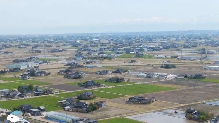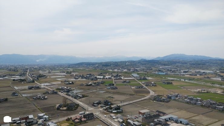 田園風景の中に立つタワーはなかなか圧巻。118メートルのタワーで展望室は100メートルの高さ。特徴的なのは田園風景に広がるが散居村と呼ばれる点在する住居。また、うっすらとではあるが立山連峰の山々も見ることができた。なお、北陸新幹線の高架橋も見えるが車両は防音壁に阻まれ、かろうじて見える程度だった。