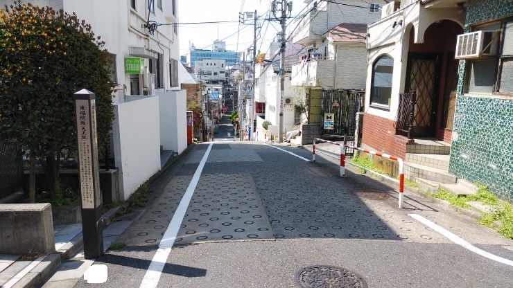 四谷三丁目駅から徒歩5分くらい。新宿通りと須賀神社を結ぶ通りにある坂道。東福院に向かって比較的急な下り坂となっていた。下りの底から須賀神社に向かって階段になっており、谷状の地形となっていた。通りは集合住宅などもある住宅街。道幅も狭く、生活道路となっていた。