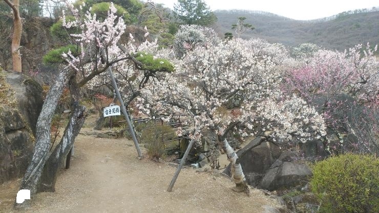 見頃を過ぎ始める時期、この機会を逃すとまた来年となってしまうので、晴れるかもしれないという天気予報を信じて訪問。天気はあいにくのどんよりとした曇。晴れていると梅の花の間に富士山が見えるようで、そちらを期待していたが全く見ることができなかった。