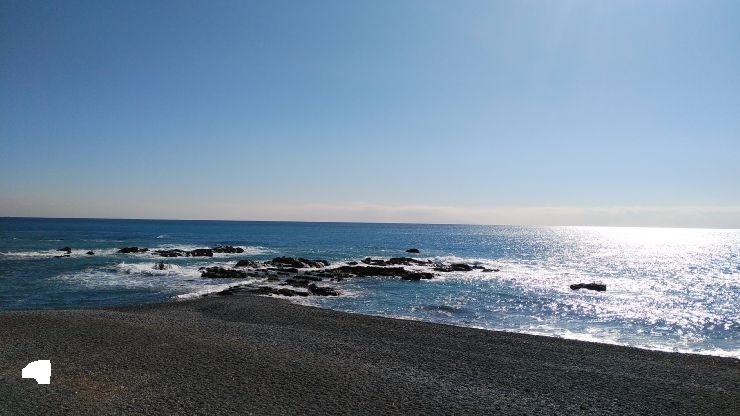 遠くまで伸びる砂浜と、わずかにある岩礁が絶景の海岸風景に満足した。時期柄、釣り人が多少いる程度の静かな海岸だった。