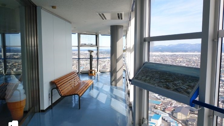 ランドマーク的な展望タワーがあり、無料で地上100メートルの展望フロアからの眺望が楽しめる。