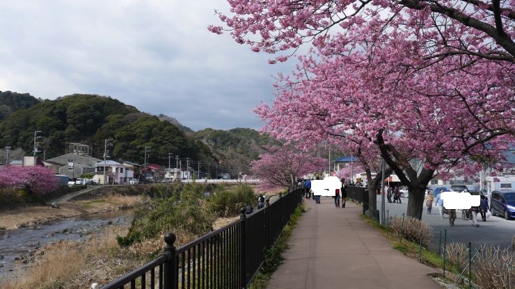 シーズン中は河津さくらまつりが開催され、駅寄りの沿道で露店があり楽しめた。