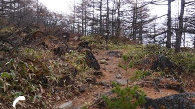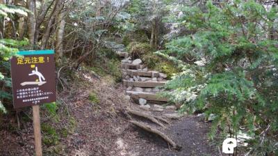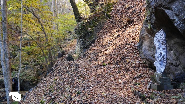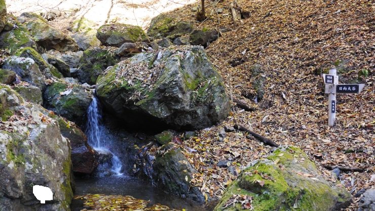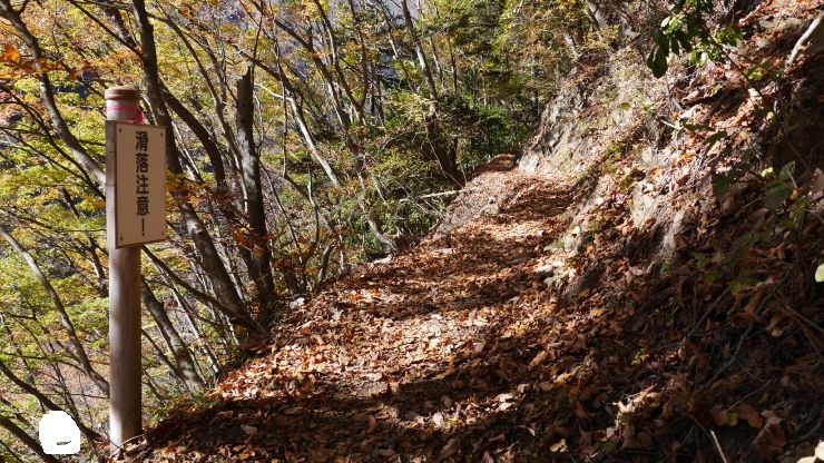 序盤は比較的なだらかな道のり。ただし、片側は崖で道も一部細く、転落の緊張感があった。登山口から1.5キロで会所に。ここは表参道コースと七滝沢コースへの分岐がある。往復表参道コースとしたが、七滝沢コースはやや距離が長く、コースが一部不明瞭、転落リスクがやや高いようだ。