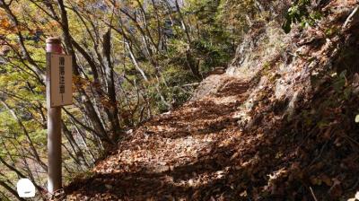 会所からは薄川に沿って何回か渡りつつ、次第に傾斜もきつくなっていく。川を越えるので増水時は注意が必要。また、落ち葉のせいかコースがわかりづらい箇所があった。ピンクテープを見落とし、2度涸沢に突っ込んでしまった。引き返しあたりを見返すと違う角度にピンクテープがあり、コースに復帰できた。樹林帯と岩場の渓谷の風景が続く。