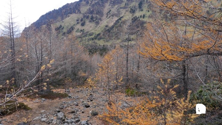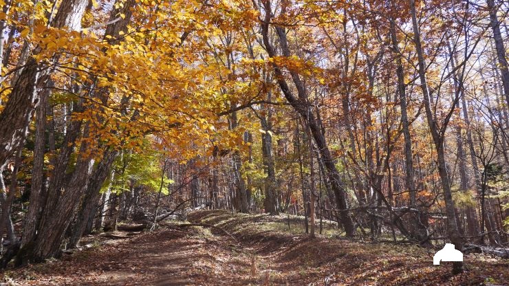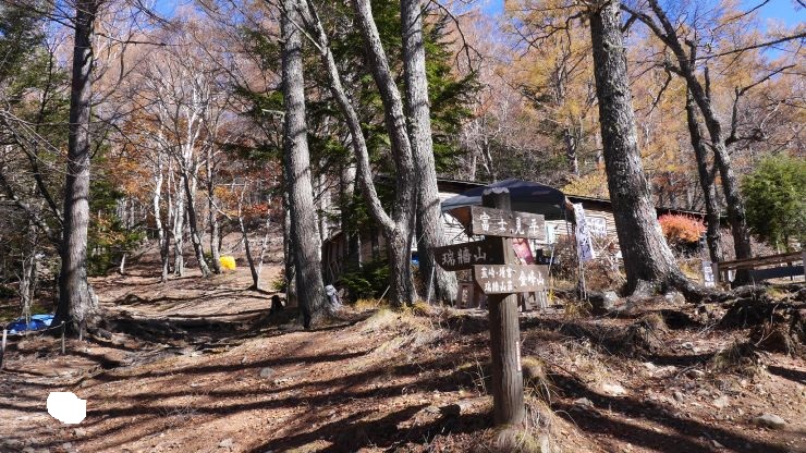 登山口からまず樹林帯をとおり富士見平小屋を目指す。序盤から傾斜はそこそこあるほか、落ち葉のせいかルートを見つけるのが難しい箇所があった。このあたりは紅葉がきれい。